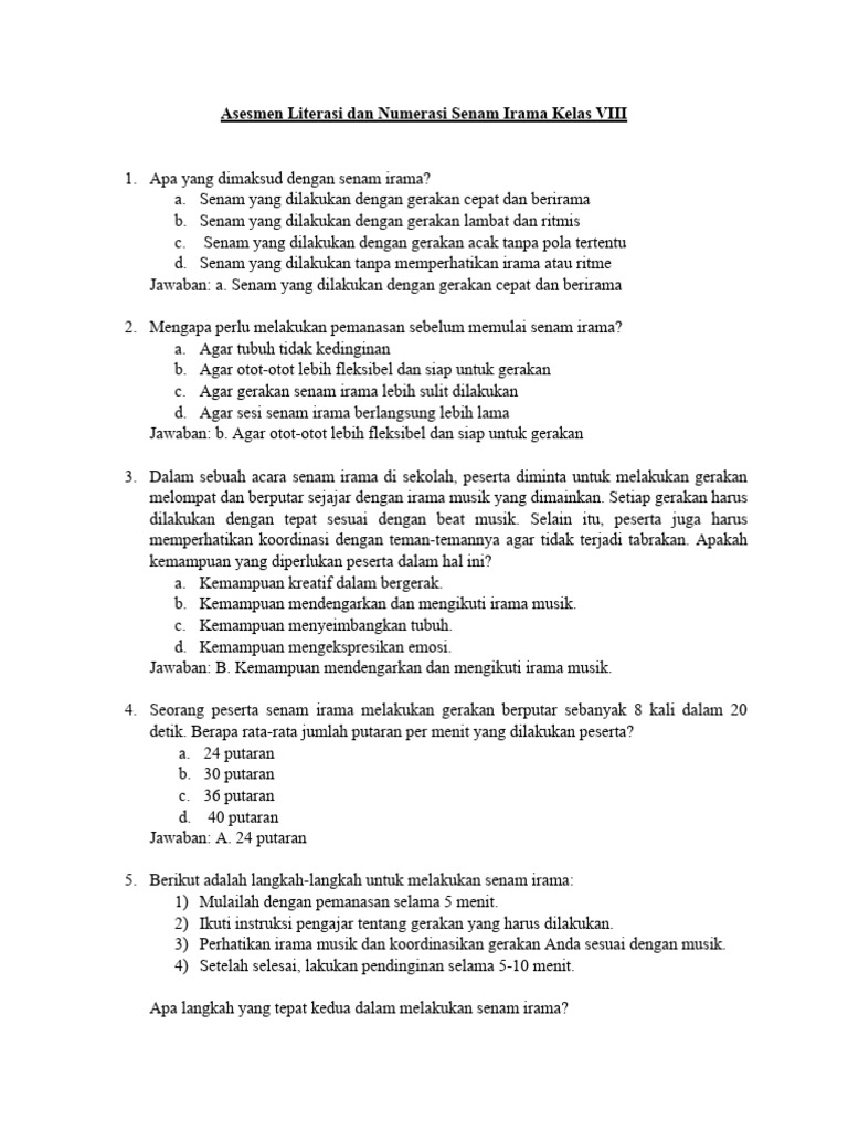 Mengerjakan soal-soal latihan seperti yang disajikan di atas adalah cara yang efektif untuk mengukur sejauh mana pemahamanmu tentang senam irama. Ini bukan hanya tentang mendapatkan nilai, tetapi tentang proses belajar dan mengetahui area mana yang perlu ditingkatkan.